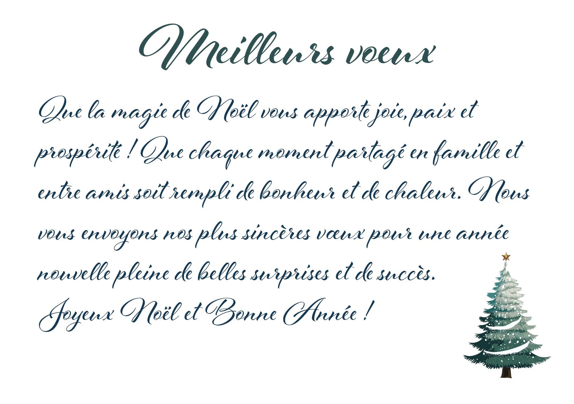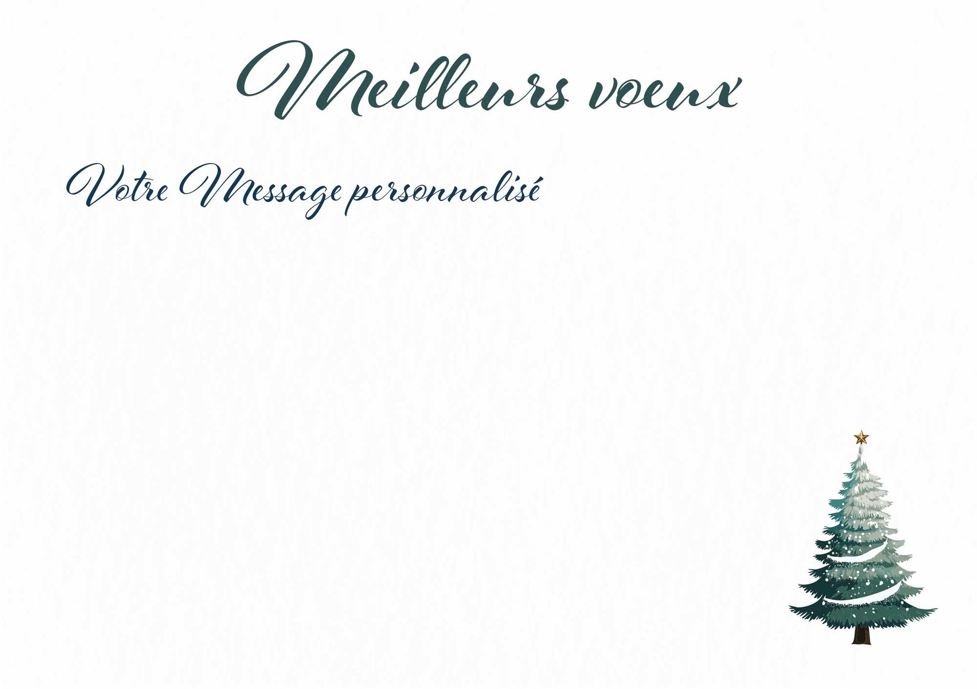 Plongez dans une atmosphère paisible et élégante avec cette carte de vœux recto verso. Son design met en avant une forêt enneigée et des sapins délicatement stylisés, accompagnés du message “Meilleurs vœux” dans une typographie raffinée. Personnalisable, cette carte de Noël est idéale pour transmettre vos vœux avec sobriété et classe : ajoutez un message unique ou laissez-la vierge pour conserver son style minimaliste. Disponible en lots de 1, 3 ou 5 exemplaires, tous compatibles avec la personnalisation, cette carte est imprimée sur un papier mat premium, garantissant des couleurs éclatantes et une finition parfaite. Livraison rapide dès 2€, pour que vos vœux arrivent à temps sans effort.